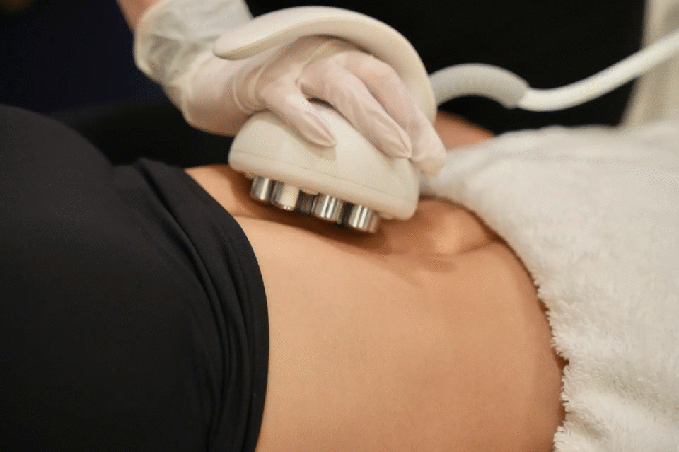 After 2–3 sessions, many clients notice mild reductions in belly circumference, smoother feel, slightly tighter skin. Over full course (6-8 sessions), more visible contour improvement is usually evident: flatter abdomen, reduced bulge, more even silhouette. Continued improvement may be seen several weeks after the last treatment as collagen and elastin continue to remodel and fat cells are processed by the body.